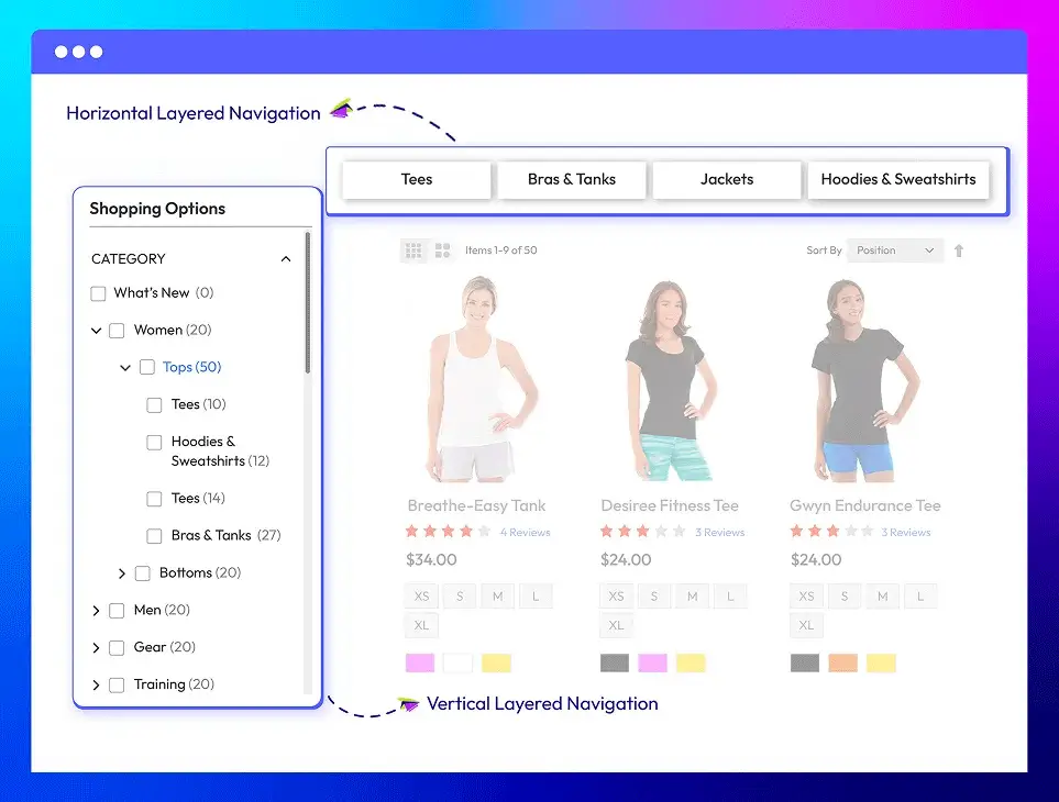 Layered Navigation for Magento 2 is a filter system that includes multiple attributes, and customers will filter out products through attributes such as color, size, style, material, price filter, rating, brand, etc. When your store has many products on the category page, you need to use Layered Navigation to help customers quickly find favorable products.