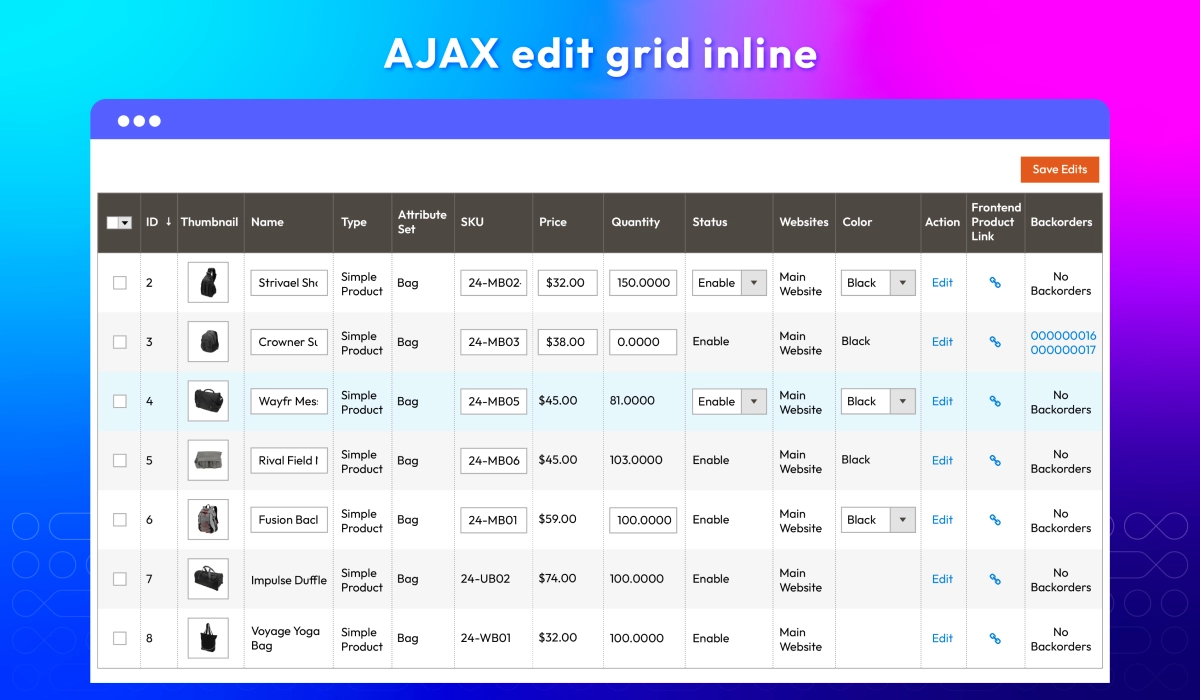 With the Magento 2 Better Product Grid extension, you no longer need to open each product page for minor edits. Update product details instantly on the grid using AJAX with three editing modes: Multiple Cells, Single Cell, and Multiple Rows for faster and more efficient catalog management