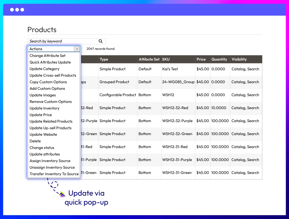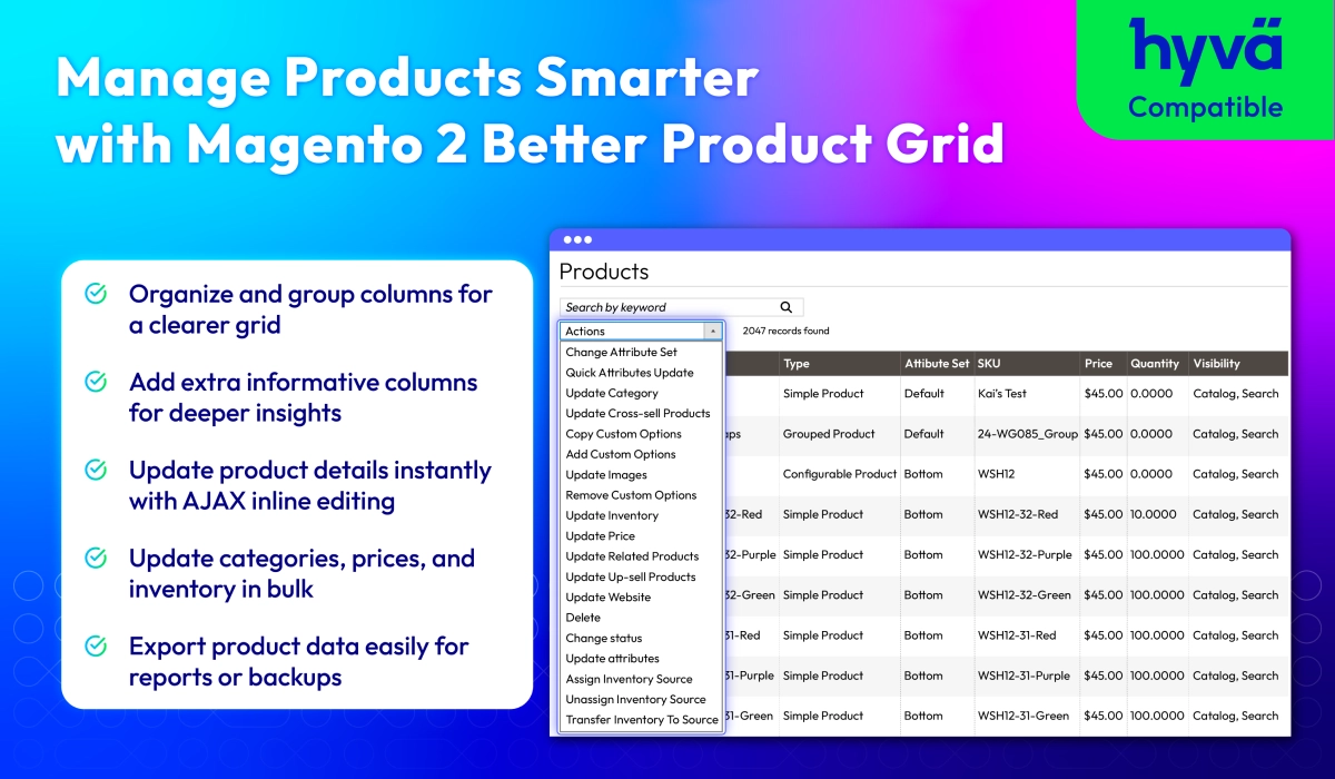 Save time by updating many products at once instead of doing it one by one. The Better Product Grid extension helps you work faster, avoid mistakes, and keep all product information clear and up to date across your store.