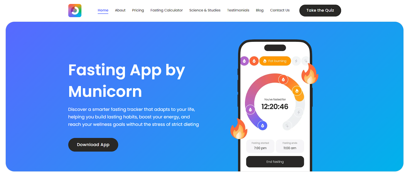Municorn’s Fasting App site is a great example of a fitness/wellness brand that wins with clarity over clutter. The homepage leads with a simple promise (make intermittent fasting sustainable), then pushes users straight into an action step (like a quiz) rather than burying them in paragraphs. It’s designed like a conversion-focused landing page: clean navigation, confidence-building pages (Testimonials / Studies & Research), and supportive tools (like a fasting calculator) that keep visitors engaged instead of bouncing.