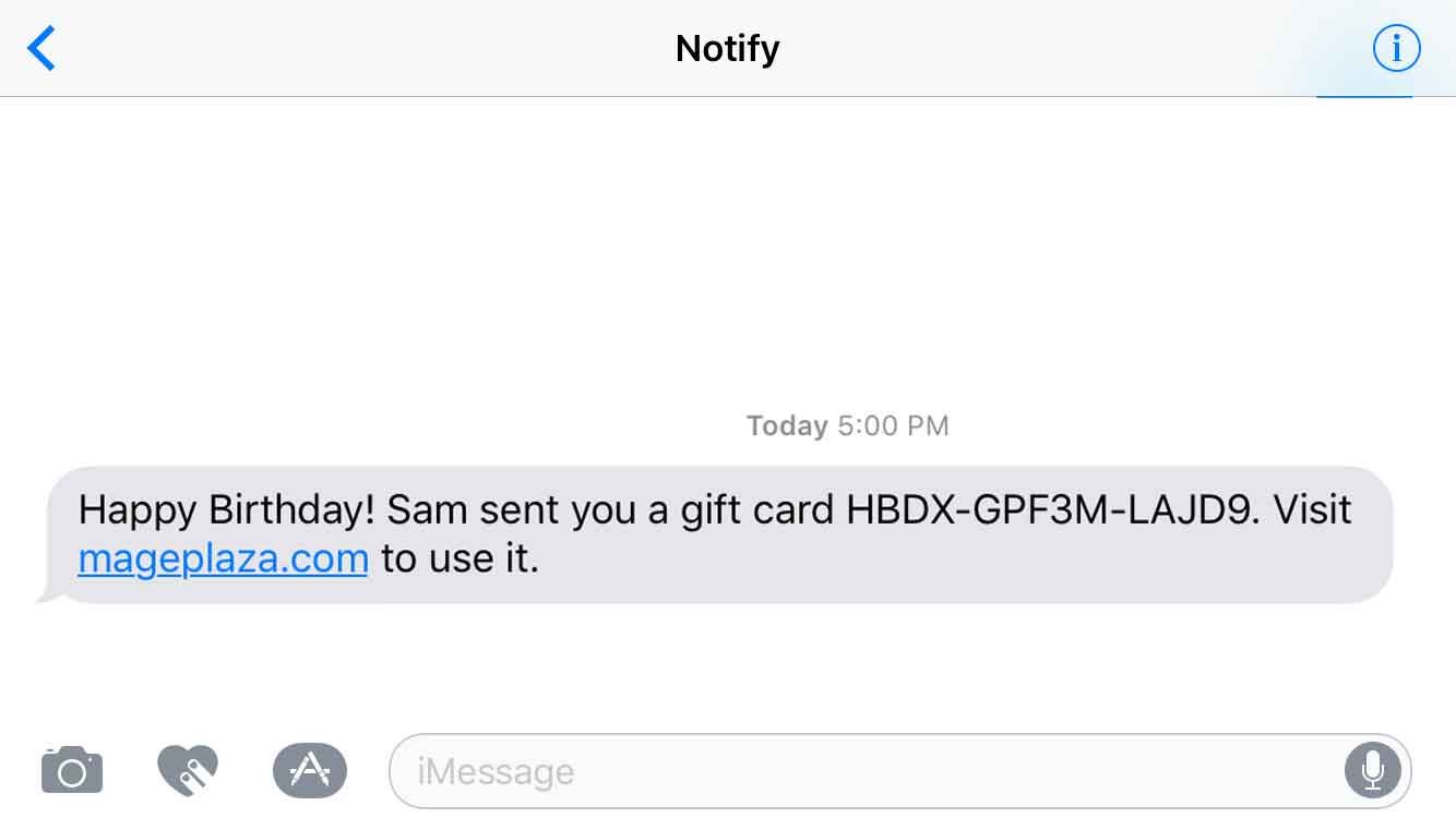 Allows admins to send SMS to gift card recipients about card’s status. Messages can be customized to appear as personal SMS with customer name. Screenshot.
